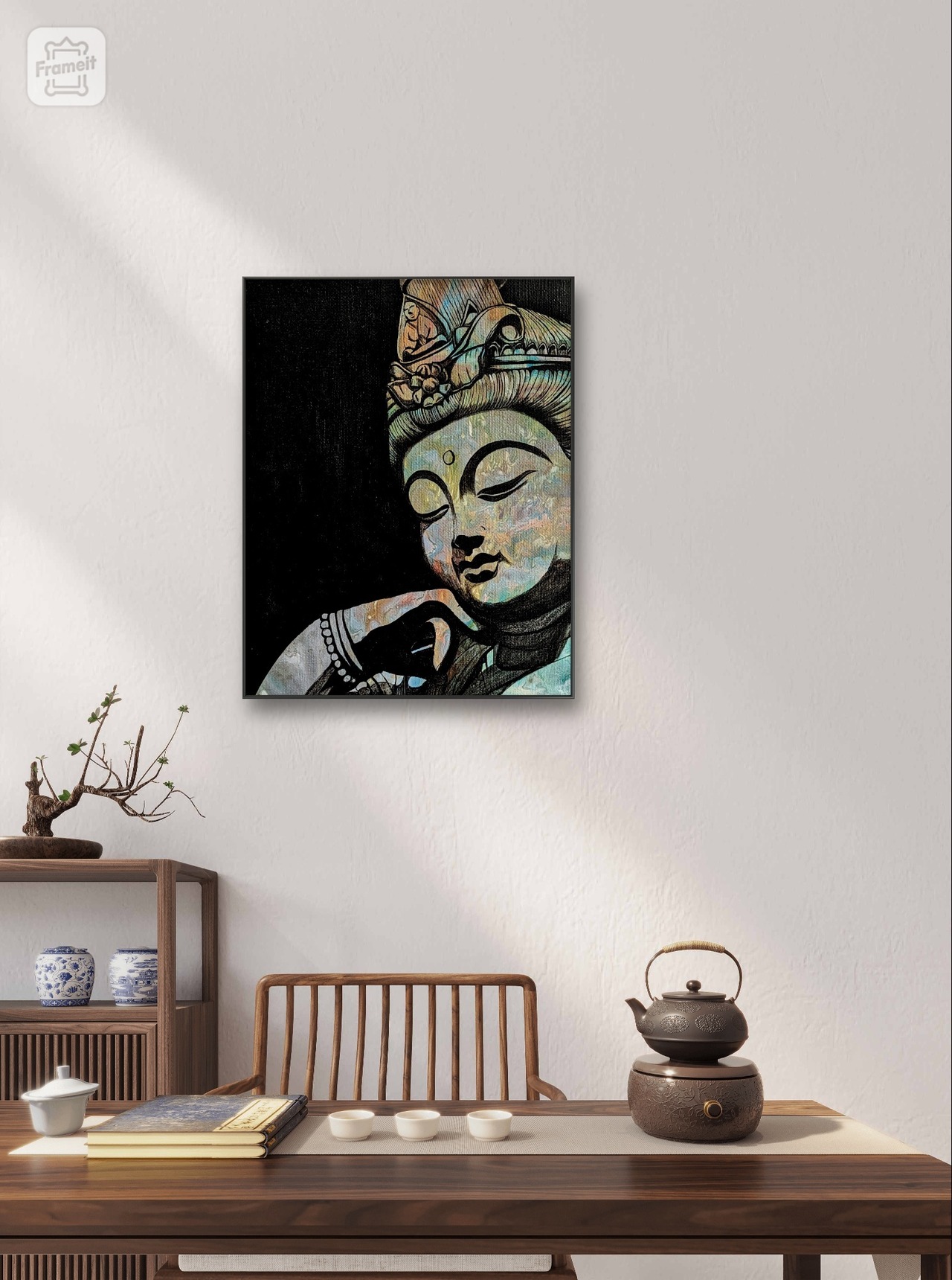 観音様らしく坐し人の心を聴くイメージで描きました。